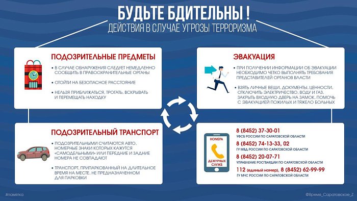 Впереди праздничные дни. В целях обеспечения безопасности и предупреждения возможных террористических проявлений необходимо быть осторожными и бдительными. При возникновении любых чрезвычайных ситуаций рекомендовано незамедлительно информировать компетентные органы.