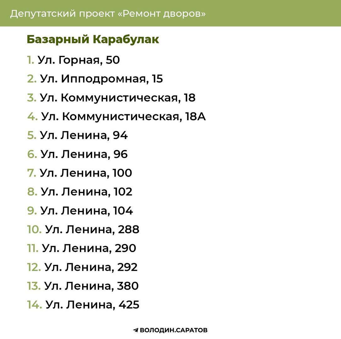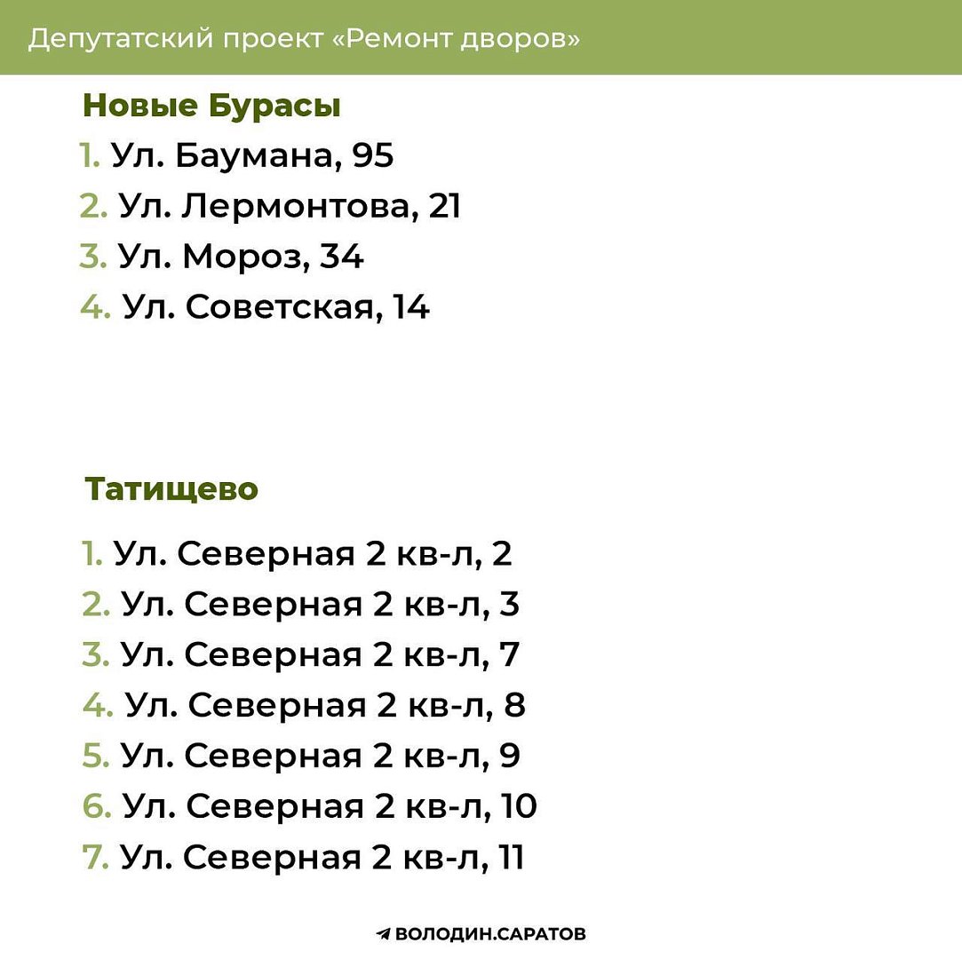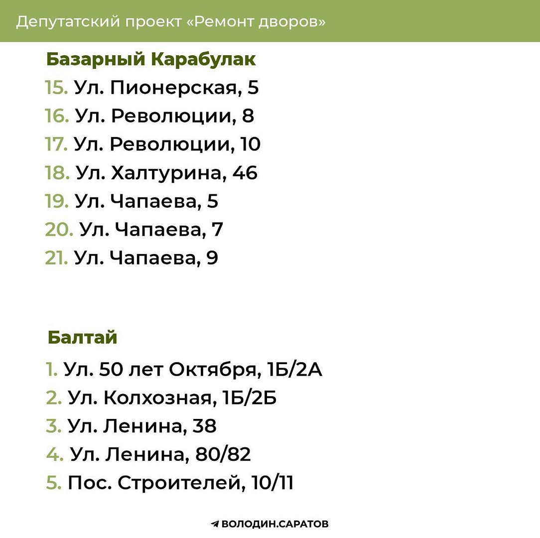 Публикуем адреса дворов 4 райцентров в рамках депутатского проекта, где после завершения ремонта будут установлены новые детские площадки.Напомним, в этом году при поддержке Володина найдены дополнительные средства на полное завершение депутатского проекта по ремонту дворов в 9 райцентрах региона: Вольске, Хвалынске, Петровске, Татищево, Базарном Карабулаке, Новых Бурасах, Светлом, Балтае и Озинках. Всего депутатский проект реализуется в 13 населенных пунктах региона.