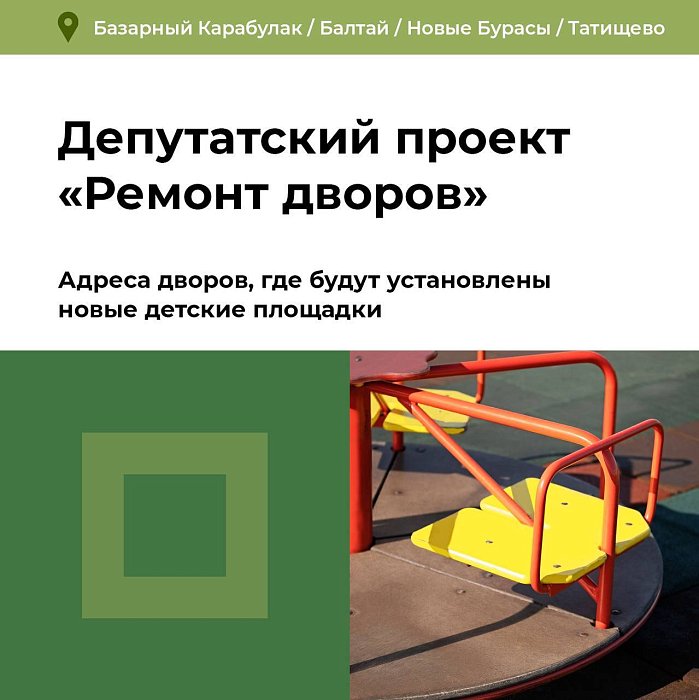 «Ремонт дворов»: адреса, где будут установлены новые детские площадки в Балтае, Новых Бурасах, Базарном Карабулаке и Татищево