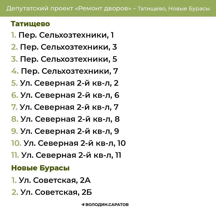 Публикуем дополнительные списки адресов домов в Татищево и Базарном Карабулаке, а также впервые списки домов в Новых Бурасах, Балтае и Озинках, где в этом году будут отремонтированы дворы в рамках депутатского проекта «Ремонт дворов». Ранее стало известно, что Вячеслав Володин нашел дополнительные средства, за счет привлеченных источников, для завершения депутатского проекта «Ремонт дворов» в этом году в пяти райцентрах: Базарном Карабулаке, Татищево, Новых Бурасах, Балтае и Озинках.