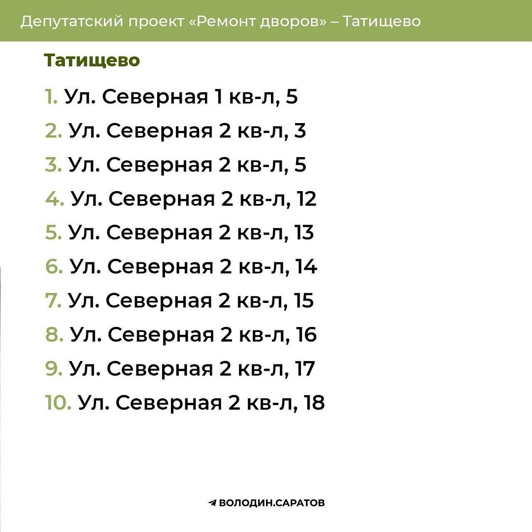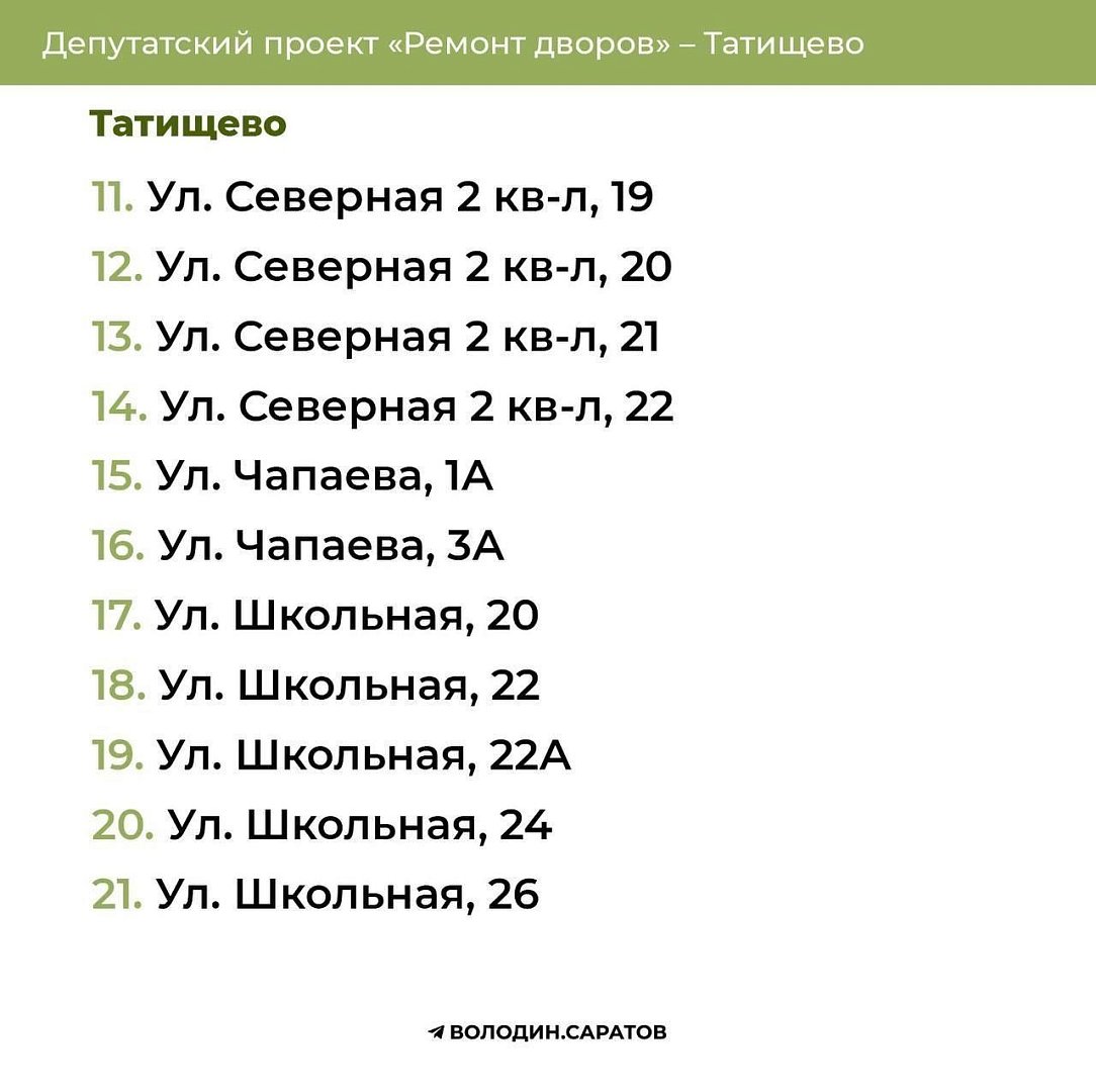 Публикуем список адресов домов р.п. Татищево из ранее присланных, дворы которых в этом году будут отремонтированы в рамках депутатского проекта «Ремонт дворов».Адреса придомовых территорий райцентра были направлены старшими домов и жильцами в паблик В.В. Володина для участия в программе по ремонту, затем отобраны специально созданной рабочей группой.