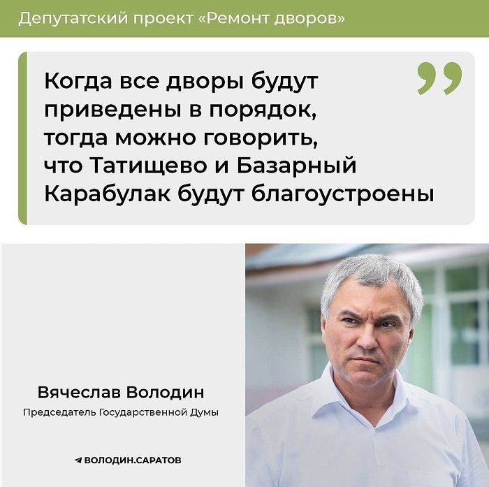 Напомним, по инициативе и при поддержке В.В. Володина реализуется трехлетний депутатский проект «Ремонт дворов». На девять населенных пунктов Саратовской области – семь городов и два райцентра – на этот год дополнительно привлечено около 2 млрд руб.