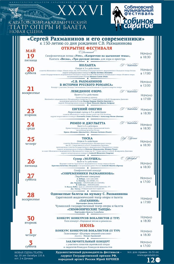 С 19 мая по 3 июня на новой сцене Саратовского театра оперы и балета пройдет XXXVI Собиновский музыкальный фестиваль, посвященный 150-летию со дня рождения Сергея Васильевича Рахманинова.