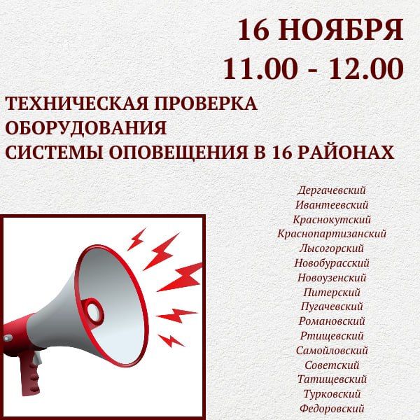 Проверка состоится 16 ноября с 11.00 до 12.00 дня. В это время будет проходить подача сигнала. Помимо включения электросирен будут работать громкоговорители, через которые жители области услышат: «ВНИМАНИЕ ВСЕМ! ПРОВОДИТСЯ ПРОВЕРКА ГОТОВНОСТИ СИСТЕМЫ ОПОВЕЩЕНИЯ НАСЕЛЕНИЯ! ПРОСЬБА СОХРАНЯТЬ СПОКОЙСТВИЕ!»Управление обеспечения безопасности жизнедеятельности населения Правительства Саратовской области и ОГУ СО «Безопасный Регион» обращаются к гражданам с просьбой сохранять спокойствие. Данная техническая проверка необходима для оценки работоспособности оборудования, установленного на очередном этапе реконструкции региональной автоматизированной системы централизованного оповещения (РАСЦО) Саратовской области.