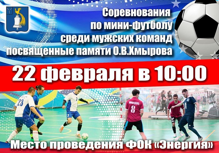 22 февраля в 10:00 состоится торжественное открытие соревнований по мини-футболу среди мужских команд, посвященных памяти О.В. Хмырова. Начало спортивных состязаний запланировано на 11:00.