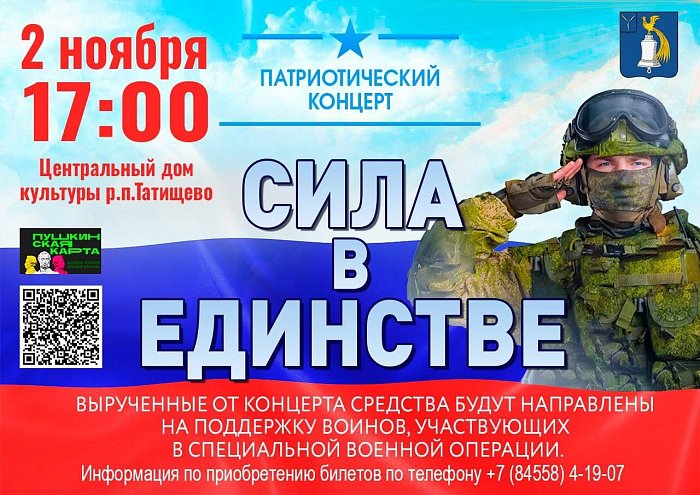 2 ноября в 17:00 в Центральном доме культуры р.п. Татищево пройдет патриотический концерт "Сила в единстве", приуроченный ко Дню народного единства.