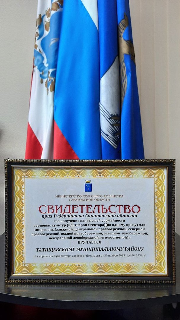 На торжественной церемонии глава региона вручил государственные и региональные награды работникам АПК Саратовской области, а глава Татищевского муниципального района П.В. Сурков получил Приз губернатора и Свидетельство «За получение наивысшей урожайности зерновых культур для микрозоны». Такой высокой награды Саратовской области, наш район удостаивается уже не в первый раз.