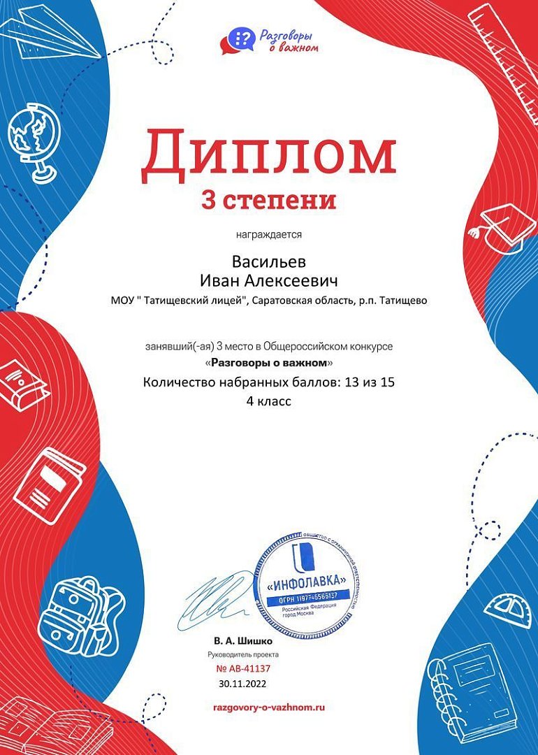 Учащиеся 4 «Г» класса Татищевского лицея (классный руководитель Анна Александровна Яремчук) приняли участие во Всероссийском конкурсе, посвященном циклу внеурочных занятий «Разговоры о важном».