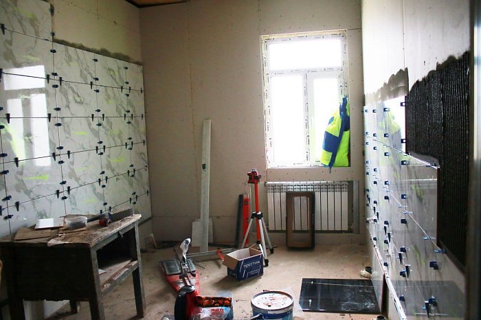 На сегодняшний день строительные работы на крыше здания закончены: заменена стропильная система и обрешетка, установлена пароизоляция, настелено 550 м2 цветной металлочерепицы, смонтированы ветровые доски, построены, оштукатурены декоративной штукатуркой и покрашены три фронтона - в одном из них поставлено слуховое окно, в другом - чердачная дверь, на центральном фронтоне разместили эмблему Министерства обороны РФ. К зданию военкомата проложено 320 метров нового водопровода, сделан ввод и разводка системы водоснабжения. Сейчас продолжаются работы по перепланировке и отделке внутренних служебных помещений и санузлов. В шести помещениях произведена замена электропроводки, отопления, стены кабинетов зашиты гипсокартоном, оштукатурены и покрашены, установлены подвесные потолки, на пол постелены древесно-стружечное покрытие и линолеум. В санузлах сделаны вводы и выводы для воды и канализации, ведётся укладка настенной и напольной плитки. Для кабинетов и санузлов приобретены мебель, жалюзи, оргтехника, оборудование и методические пособия.